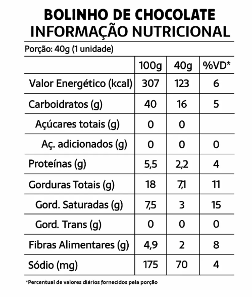 Mix sem glúten (farinha de arroz, amido modificado, farinha integral de soja não transgênica, farinha de quinoa, fécula de mandioca), óleo vegetal (soja e palma), ovo em pó, gotas de chocolate amargo, fibra solúvel polidextrose, cacau em pó, edulcorantes maltitol e glicosídeos de esteviol, umectantes sorbitol e glicerol, emulsificantes mono e diglicerídeos e ésteres de poliglicerol de ácidos graxos e goma xantana, fermento químico pirofosfato dissódico e bicarbonato de sódio, conservantes propionato de cálcio e sorbato de potássio, acidulante ácido cítrico e aromas. NÃO CONTÉM GLÚTEN. ALÉRGICOS: CONTÉM DERIVADOS DE SOJA E OVO.