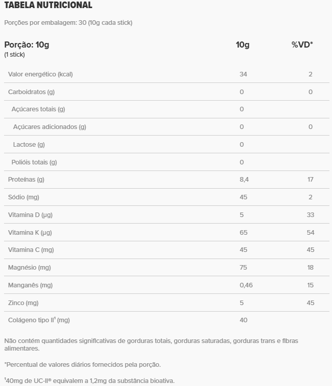 Colágeno hidrolisado em peptídeos (Peptan®), bisglicinato de magnésio, goma guar, ascorbato de sódio, bisglicinato de zinco, colágeno de frango com colágeno tipo II não desnaturado (UC-II®), menaquinona-7, fitomenadiona, bisglicinato de manganês, colecalciferol, antiumectante dióxido de silício e aroma natural.