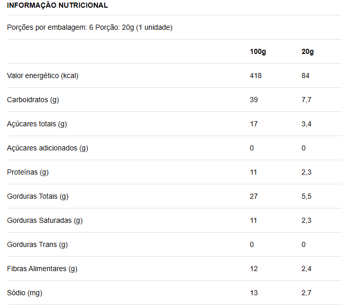 Tâmara, chocolate 70% cacau, aveia em flocos, castanha de caju, amêndoa, amendoim, xarope de tapioca e óleo de coco.