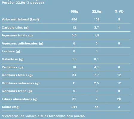Paçoca de castanha-de-caju, amendoim e coco (castanha-de-caju, polidextrose, amendoim, proteína de ervilha, coco ralado fino desidratado parcialmente desengordurado, soro de leite concentrado parcialmente desmineralizado zero lactose (whey protein zero lactose), sal marinho refinado iodado e edulcorante glicosídeos de esteviol de Stevia rebaudiana Bertoni) e chocolate ao leite (polidextrose, manteiga de cacau, leite em pó integral zero lactose, nibs de cacau, soro de leite concentrado parcialmente desmineralizado zero lactose (whey protein zero lactose), emulsificante lecitina de soja e edulcorante glicosídeos de esteviol de Stevia rebaudiana Bertoni) ALÉRGICOS: CONTÉM AMENDOIM, CASTANHA-DE-CAJU E DERIVADOS DE LEITE E SOJA. PODE CONTER AMÊNDOA, AVELÃ, CASTANHA-DO-PARÁ, CASTANHAS, MACADÂMIA, NOZES, OVO, PECÃ, PINOLI, PISTACHE E TRIGO. NÃO CONTÉM LACTOSE. CONTÉM GLÚTEN.