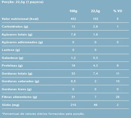 - Baixo teor de carboidratos e gorduras trans zero, garantindo qualidade nutricional superior