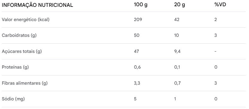 Amora (51%). sucos concentrados de uva e tâmara, suco de limão, estabilizante pectina. Não contém glúten.