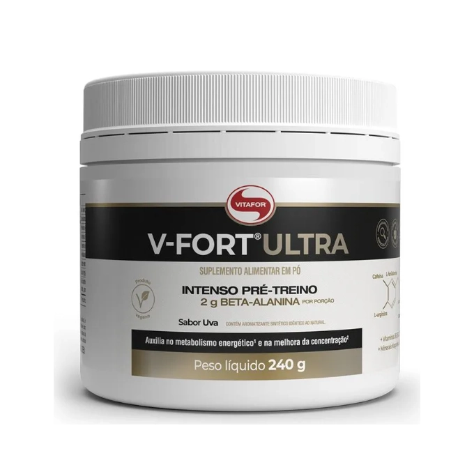 V FORT ULTRAV-FORT® ULTRA é o intenso pré-treino da Vitafor, desenvolvido com uma fórmula inovadora e responsável que possui ingredientes estratégicos para melhorar o desempenho na prática de atividades físicas e esporte.Quando conseguimos tirar do nosso corpo o máximo durante o exercício físico colhemos melhores resultados. É preciso subir gradativamente a dificuldade do exercício para manter o desafio e com isso possibilitar o crescimento muscular e melhores rendimentos nos esportes.Milhões de pessoas se esforçam na prática esportiva, mas não alcançam os resultados desejados. Os nutrientes corretos auxiliam no desempenho esportivo, aproximando o praticante de suas metas.Seja por uma alimentação deficiente, uma noite mal dormida, alguma indisposição ou simplesmente pela variação do nosso ritmo, não conseguimos extrair o máximo de nosso treinamento.Exercícios curtos e intensos levam a fadiga muscular mais rápida, prejudicando o rendimento do atleta. A Carnosina é uma substância composta pelos aminoácidos L-histidina e Beta-Alanina e sua função nos músculos é diminuir a acidez e fadiga muscular.A ingestão de Beta-Alanina ajuda na produção de Carnosina. Estudos demonstram melhora na fadiga muscular em grupos de estudos fizeram a ingestão na forma de suplementos de Beta-Alanina por um período de quatro semanas.V-FORT® ULTRA em sua formulação contém 2g de Beta-Alanina, além de cafeína para ajudar no estado de alerta, e enriquecido com vitaminas e minerais que auxiliam o sistema imunológico e auxiliam na proteção dos danos causados pelos radicais livres.INGREDIENTES