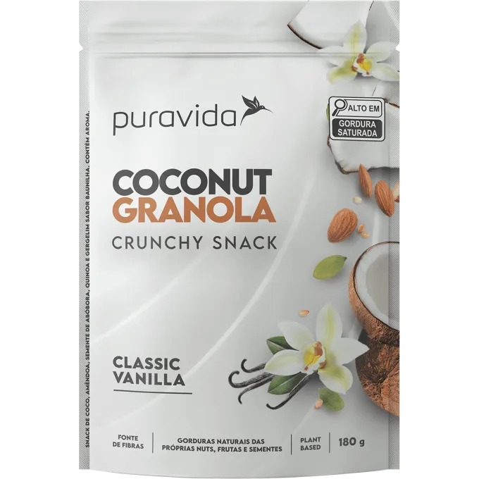 A Coconut Granola Vanilla Chocolate soma-se a duas outras opções de granolas da Puravida, de qualidade excepcional, elaborado com adoçantes