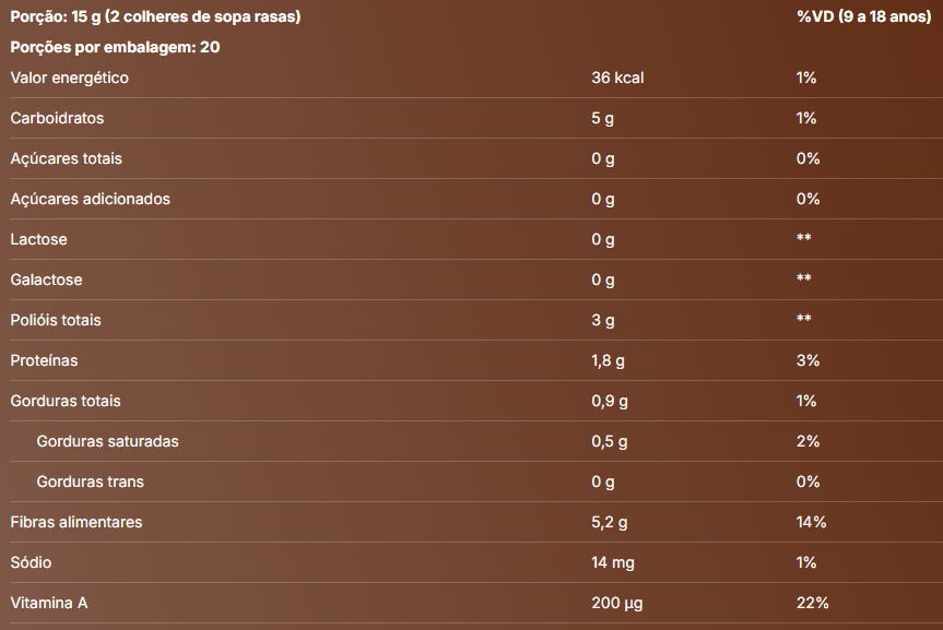 Ideal para complementar a dieta com nutrientes essenciais, auxilia no reforço nutricional, principalmente de crianças, sendo uma opção prática e saudável para lanches e cafés da manhã, além de ser ideal para compor várias receitas.