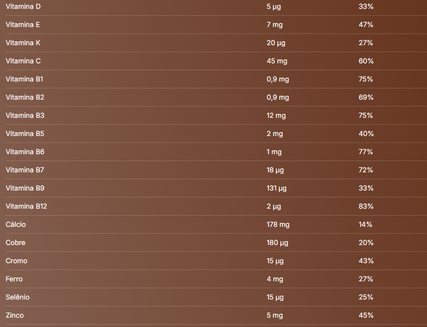 Cacau em pó, fosfato tricálcico (cálcio), ascorbato de cálcio (vitamina C), bisglicinato de zinco (zinco), bisglicinato ferroso (ferro), acetato de dl-alfa-tocoferila (vitamina E), nicotinamida (vitamina B3), d-pantotenato de cálcio (ácido pantotênico/vitamina B5), fitonadiona (vitamina K1), selenometionina (selênio), acetato de retinol (vitamina A), cloridrato de piridoxina (vitamina B6), tiamina mononitrato (vitamina B1), riboflavina (vitamina B2), bisglicinato de cobre (cobre), L-metilfolato de cálcio (ácido fólico), picolinato de cromo (cromo), d-biotina (biotina), colecalciferol (vitamina D), metilcobalamina (vitamina B12), edulcorantes eritritol, maltitol, glicosídeos de esteviol de Stevia rebaudiana Bertoni e taumatina, emulsificantes goma acácia, goma guar e goma xantana, aromatizantes naturais e antiumectante dióxido de silício. NÃO CONTÉM GLÚTEN.