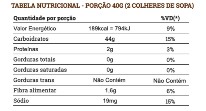 Açúcar, farinha de arroz, chocolate em pó 50% cacau, polvilho doce, açúcar de baunilha, bicarbonato de sódio, sal marinho e goma xantana.