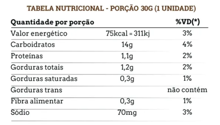Farinha de arroz, polvilho doce, abóbora, água, óleo de girassol, farinha de soja não transgênica, ovo, fermento biológico, vinagre de maçã, sal marinho, goma xantana, amido de milho, ácido sórbico, sorbato de potássio, ácido cítrico, carbonato de cálcio, propinato de cálcio, ésteres de mono e diglicerídeos com ácidos graxos, goma guar e sorbitol.