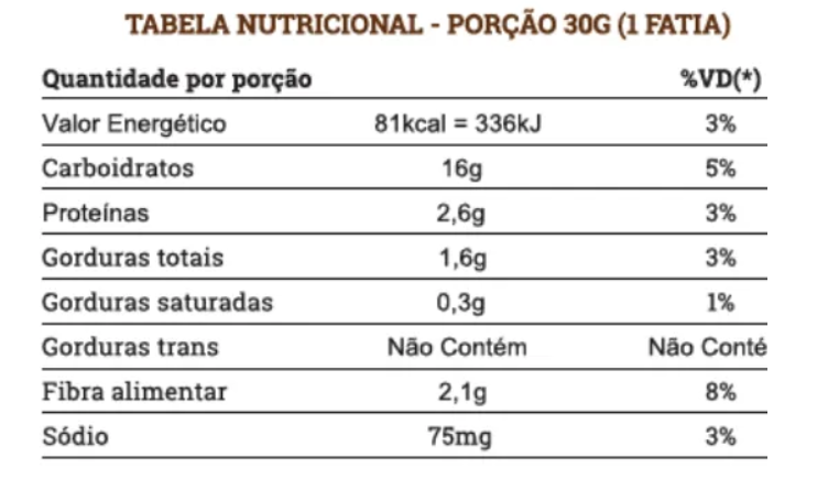 Farinha de arroz, polvilho doce, batata doce, água, óleo de girassol, farinha de soja não transgênica, ovo, açúcar demerara, fermento biológico, vinagra de maçã, gergelim, linhaça dourada, chia, semente de girassol, sal marinho, goma xantana, amido de milho, ácido sórbico, sorbato de potássio, ácido cítrico, carbonato de cálcio, propinato de cálcio, ésteres de mono e diglicerídeos com ácidos graxos, goma guar e sorbitol.