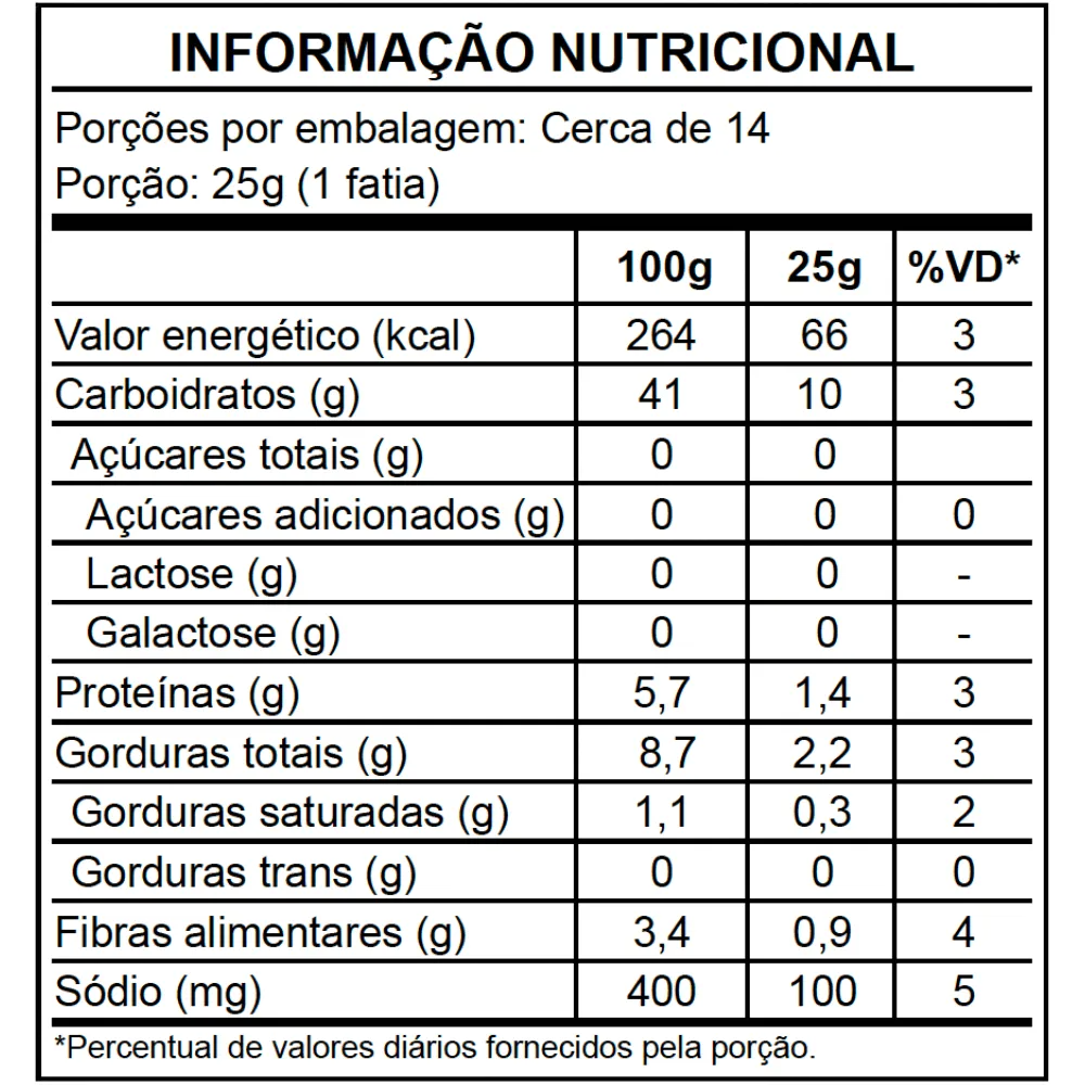Farinha de arroz, polvilho doce, água, óleo de soja, farinha de soja não transgênica, fermento biológico, vinagre de maçã, sal marinho, goma xantana, amido de milho, ácido sórbico, sorbato de potássio, ácido cítrico, carbonato de cálcio, propinato de cálcio, ésteres de mono e diglicerídeos com ácidos graxos, goma guar e sorbitol.