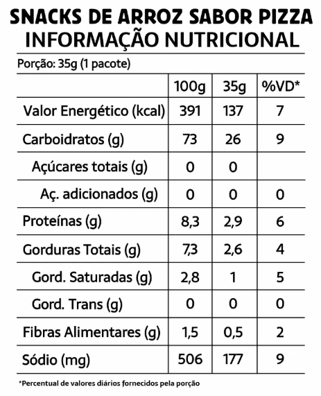 Mix sem glúten (farinha de arroz, lentilha e quinoa), óleo vegetal (palma e soja), sal light, extrato de levedura, aromatizante e corante natural urucum. NÃO CONTÉM GLÚTEN. ALÉRGICOS: CONTÉM DERIVADOS DE SOJA.