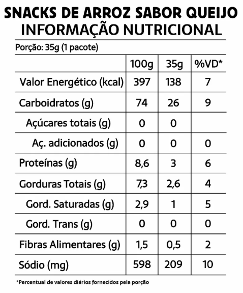 Mix sem glúten (farinha de arroz, lentilha e quinoa), óleo vegetal (palma e soja), extrato de levedura, aromatizante e corante natural urucum. NÃO CONTÉM GLÚTEN. ALÉRGICOS: CONTÉM DERIVADOS DE SOJA.
