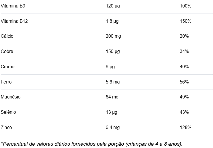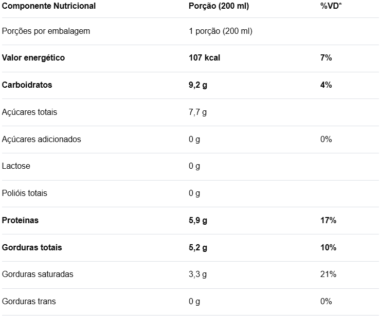 Leite integral A2 reconstituído, cacau em pó, citrato de magnésio, bisglicinato de magnésio, bisglicinato de zinco, acetato de tocoferol (vitamina E), nicotinamida (vitamina B3), glicinato férrico, pantotenato de cálcio (vitamina B5), L-selenometionina, piridoxal-5-fosfato (vitamina B6), riboflavina-5-fosfato (vitamina B2), bisglicinato de cobre, cloridrato de tiamina (vitamina B1), acetato de retinol (vitamina A), fitomenadiona (vitamina K1), menaquinona-7 (vitamina K2), ácido fólico (vitamina B9), L-metilfolato de cálcio (vitamina B9), picolinato de cromo, biotina (vitamina B7), colecalciferol (vitamina D), metilcobalamina (vitamina B12), cianocobalamina (vitamina B12), aromas idênticos aos naturais, reguladores de acidez fosfato dissódico e fosfato dipotássico, antiumectante fosfato tricálcico, espessantes gomas gelana e carragena, edulcorante glicosídeos de esteviol (estévia).
