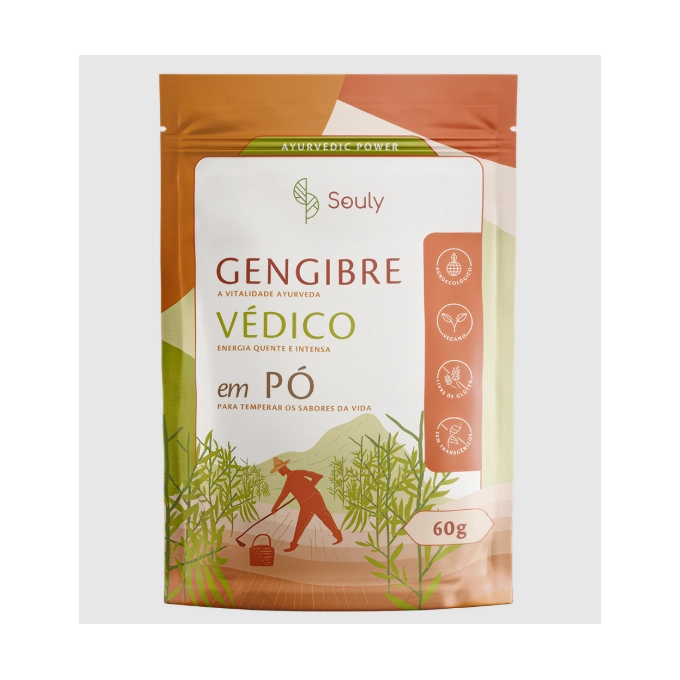 GENGIBRE VÉDICO EM PÓO gengibre em pó Souly é um superalimento funcional com origem nobre e propriedades terapêuticas reverenciadas há milênios pela medicina Ayurveda. Cultivado em solos férteis e preservados da Índia, por pequenos produtores em escala sustentável, este rizoma poderoso carrega consigo a força vital de uma das especiarias mais completas da natureza.