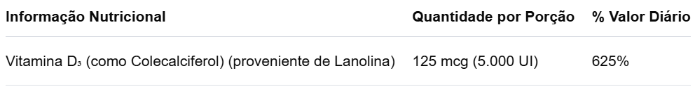 Vitamina D3, Cápsula Softgel (gelatina bovina, água, glicerina) e Azeite de Oliva Extra Virgem.